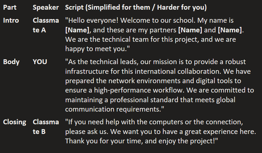 Intercultural Strategy: We focused on clear pronunciation and moderate speed. In an international context, speaking too fast can cause confusion. By using technical cognates (infrastructure, collaboration, project), we ensure the message is accessible to all professional participants.