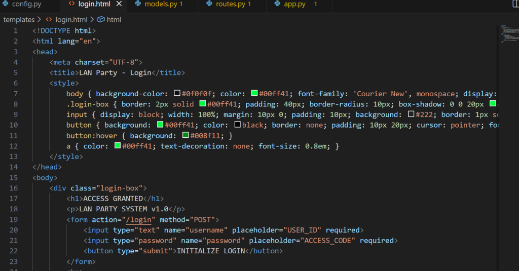 login.html.Disseny: Hem utilitzat HTML5 i CSS per donar-li un estil “Gaming/Hacker” amb colors negres i neó verd, adequat per a una LAN Party.